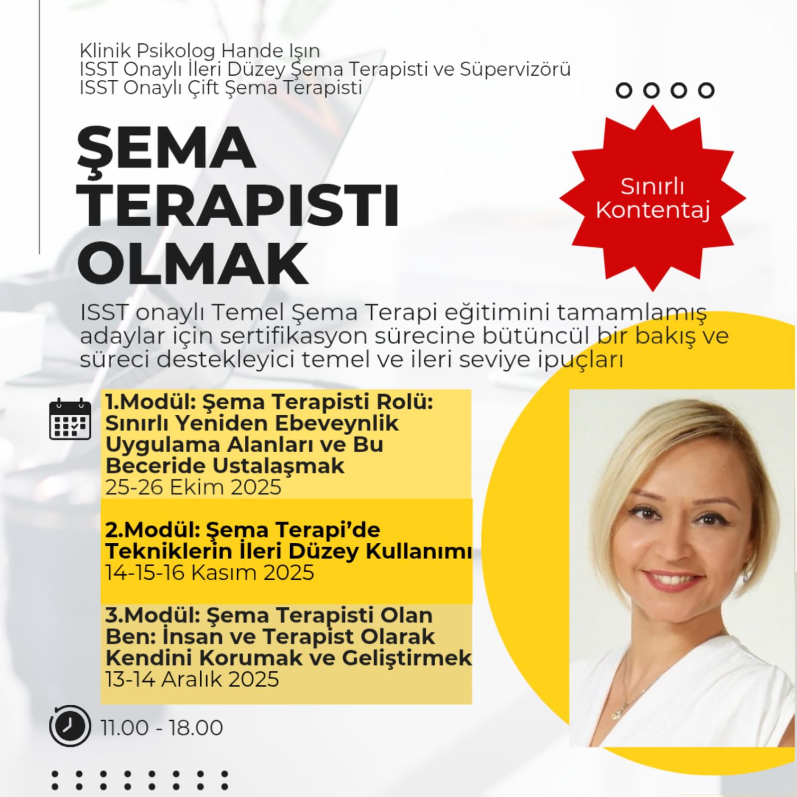 Bu süreçte yalnızca teorik bilgiye odaklanmayacağız; seansın yapısından danışan takibine, vaka kavramsallaştırmadan imgeleme ve sandalye tekniğine kadar terapinin merkezinde yer alan tüm uygulamaları birlikte ele alarak deneyimleyeceğiz.